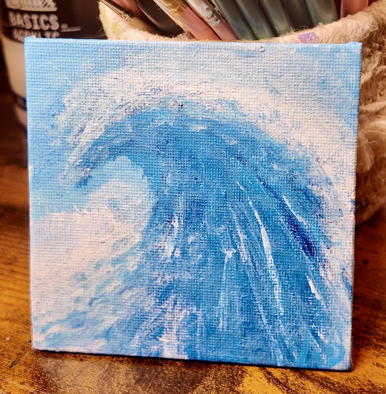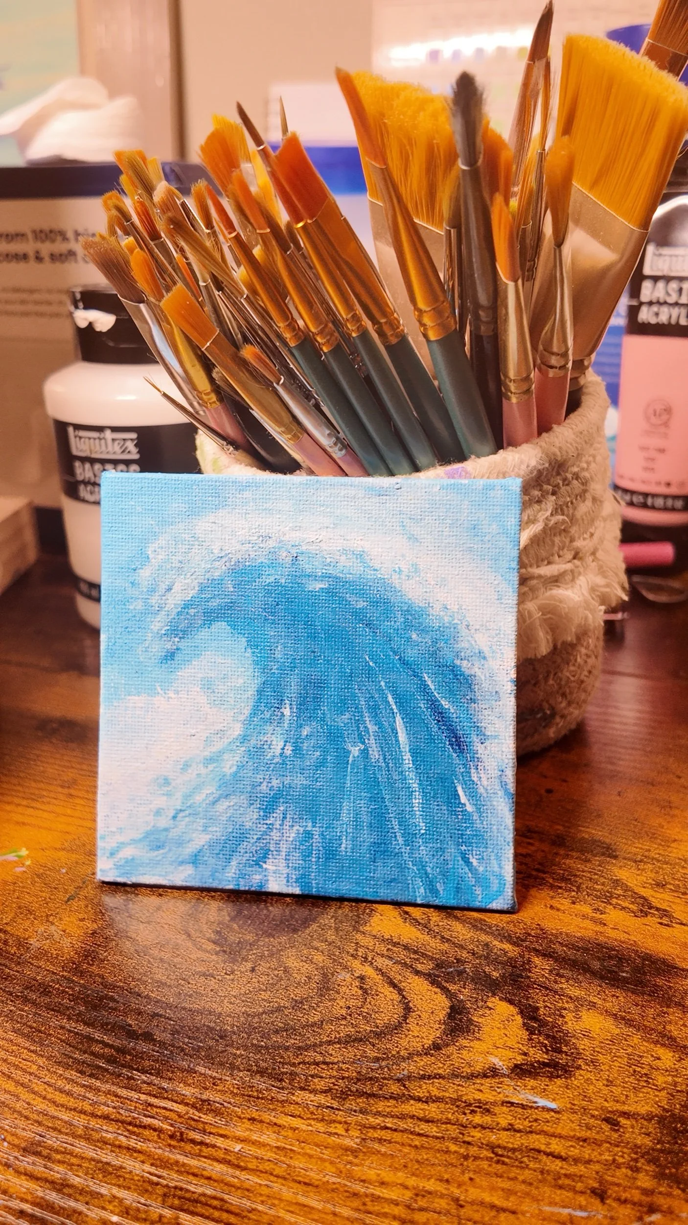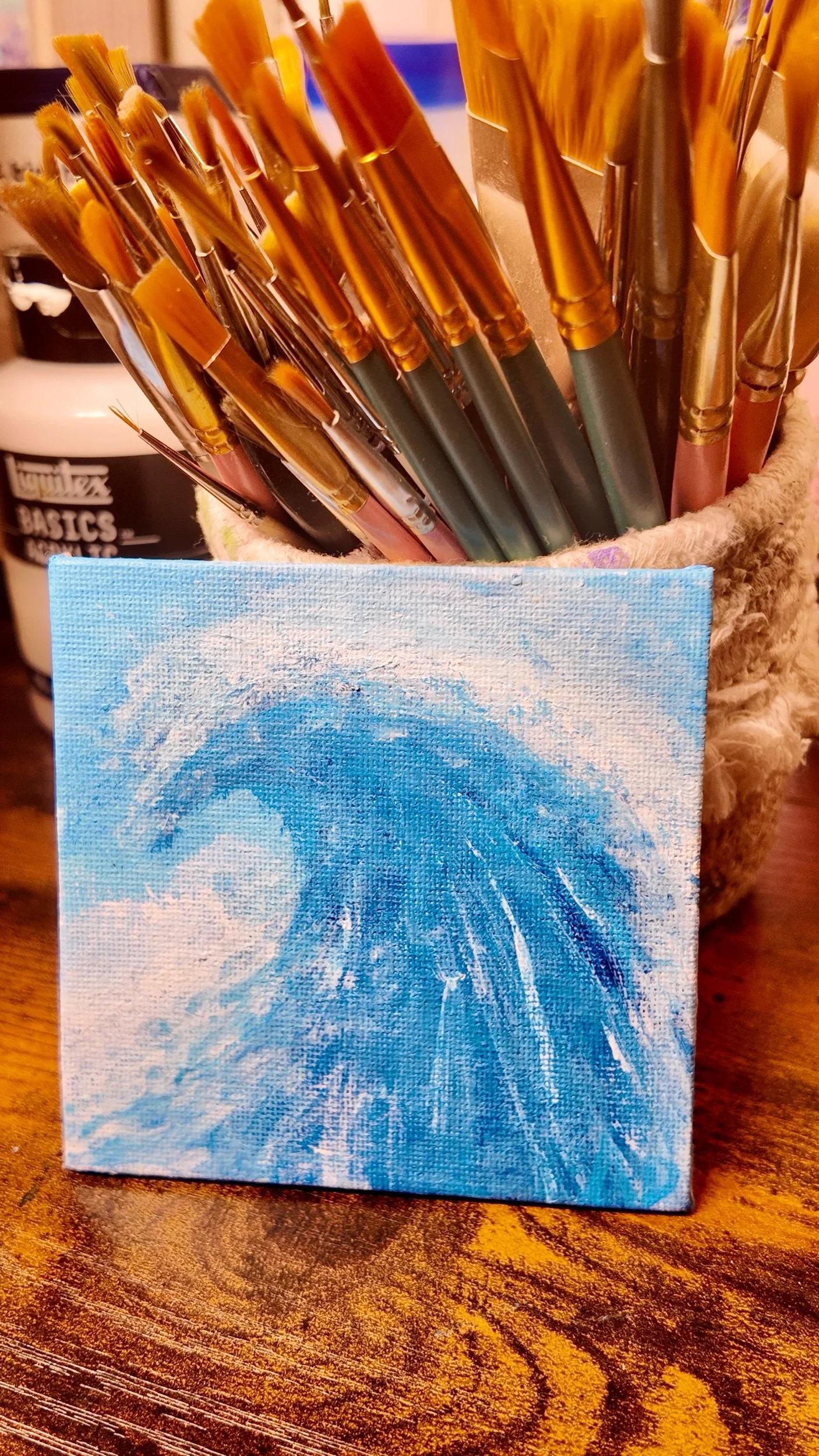 This original 4 x 4 acrylic painting captures the raw energy and movement of a crashing wave in a minimal, expressive style. Layers of soft blues and textured white strokes create a sense of motion and calm all at once, evoking the rhythm of the ocean in a small, intimate format. Painted on a canvas panel, this one-of-a-kind piece is perfect for adding a touch of serenity and coastal inspiration to any space, whether displayed on a shelf, desk, or gallery wall.