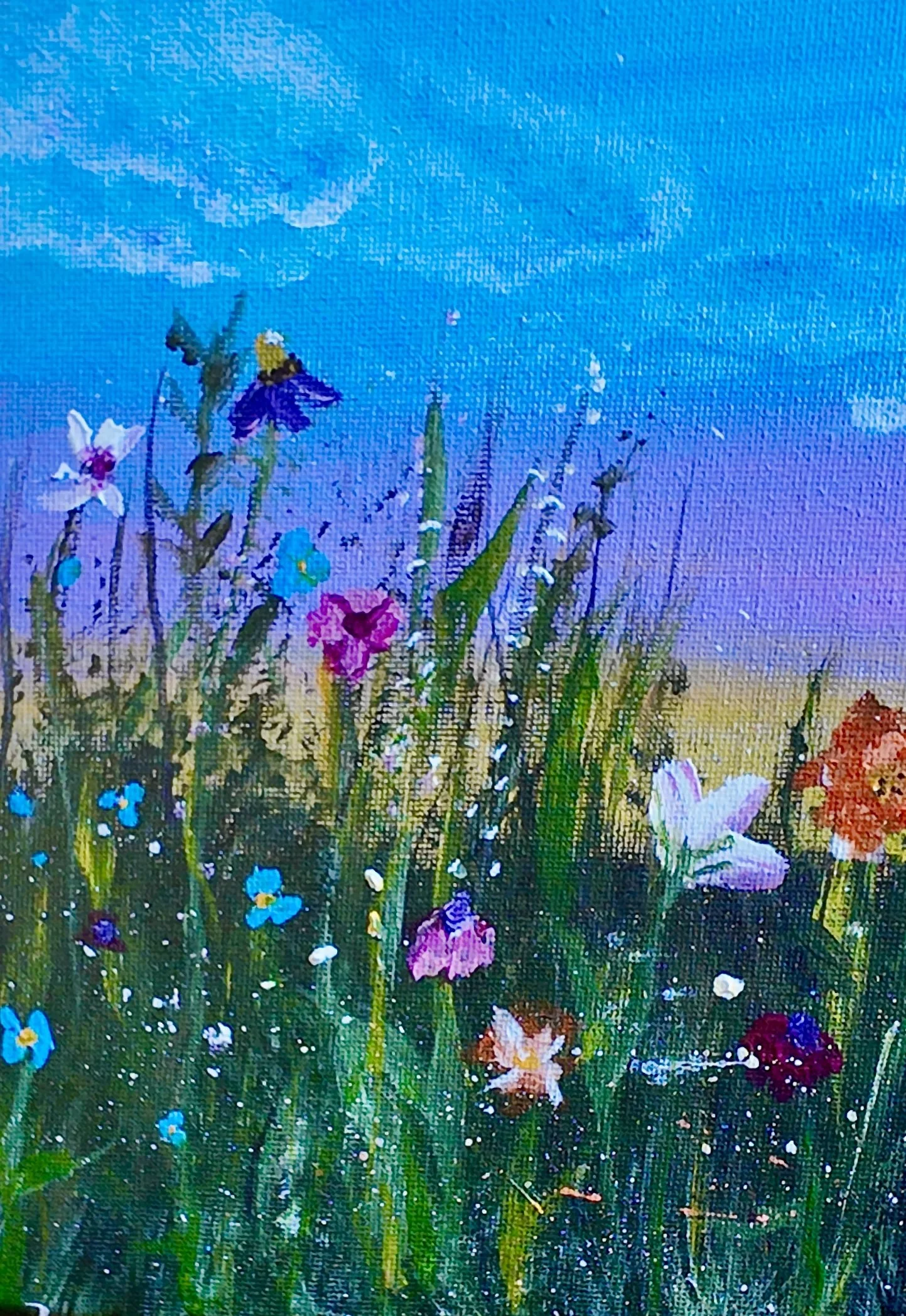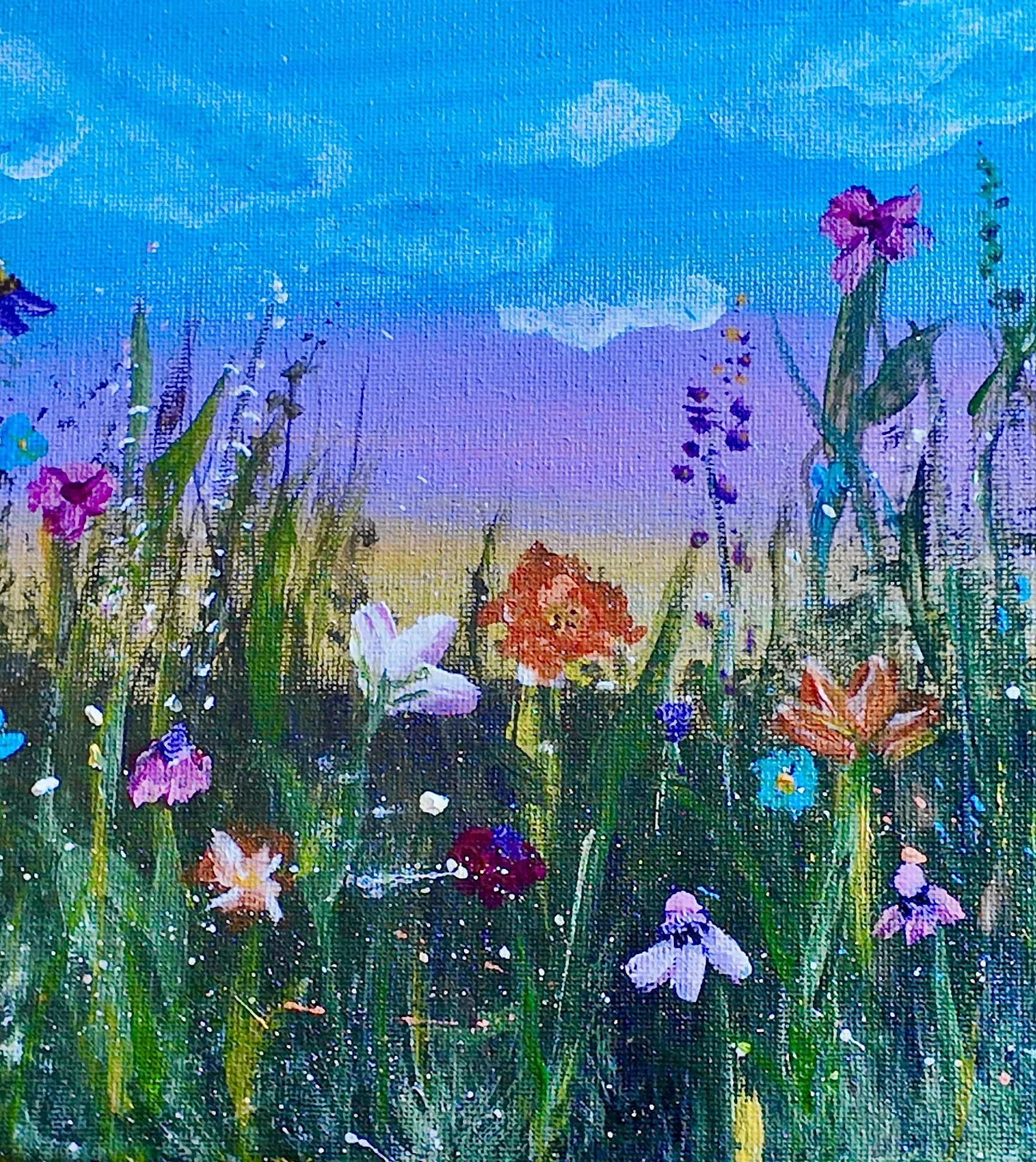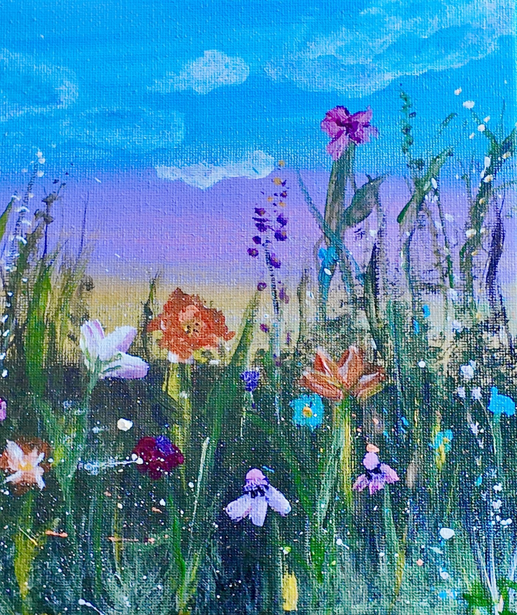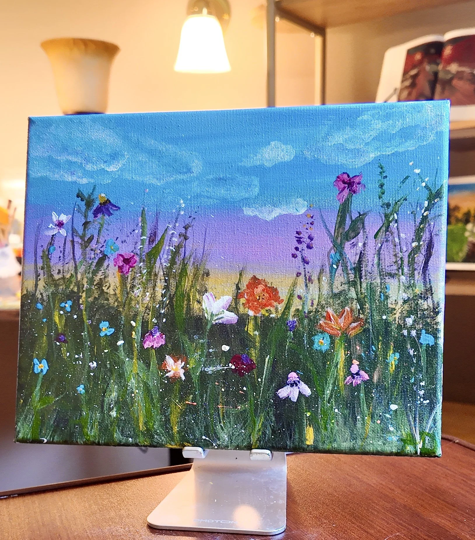 This original 8 x 10 acrylic painting on canvas captures a dreamy wildflower meadow beneath a soft, pastel sky. Hand-painted with layered textures and delicate brushwork, each bloom is uniquely detailed, creating a sense of depth, movement, and quiet beauty. The vibrant pops of color contrast beautifully with the calming background, making this one-of-a-kind piece both eye-catching and serene—perfect for bringing a touch of nature and warmth into any space!