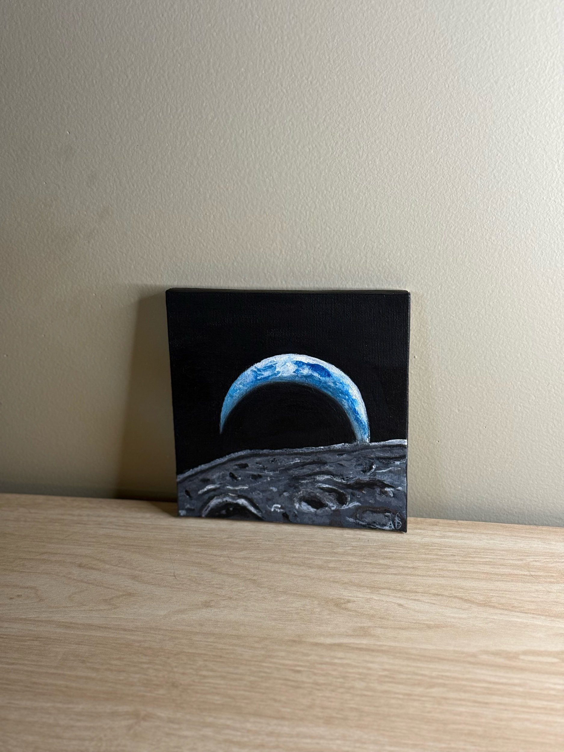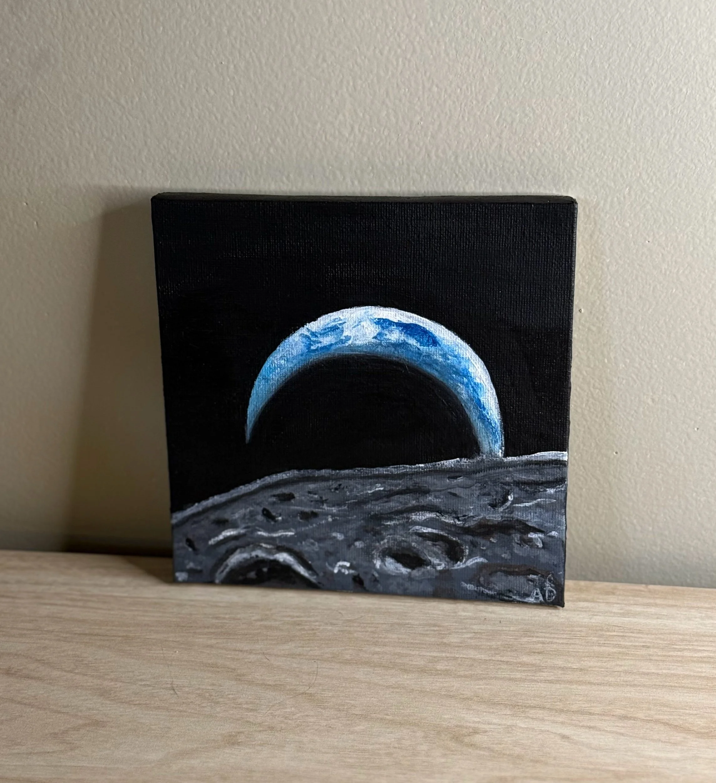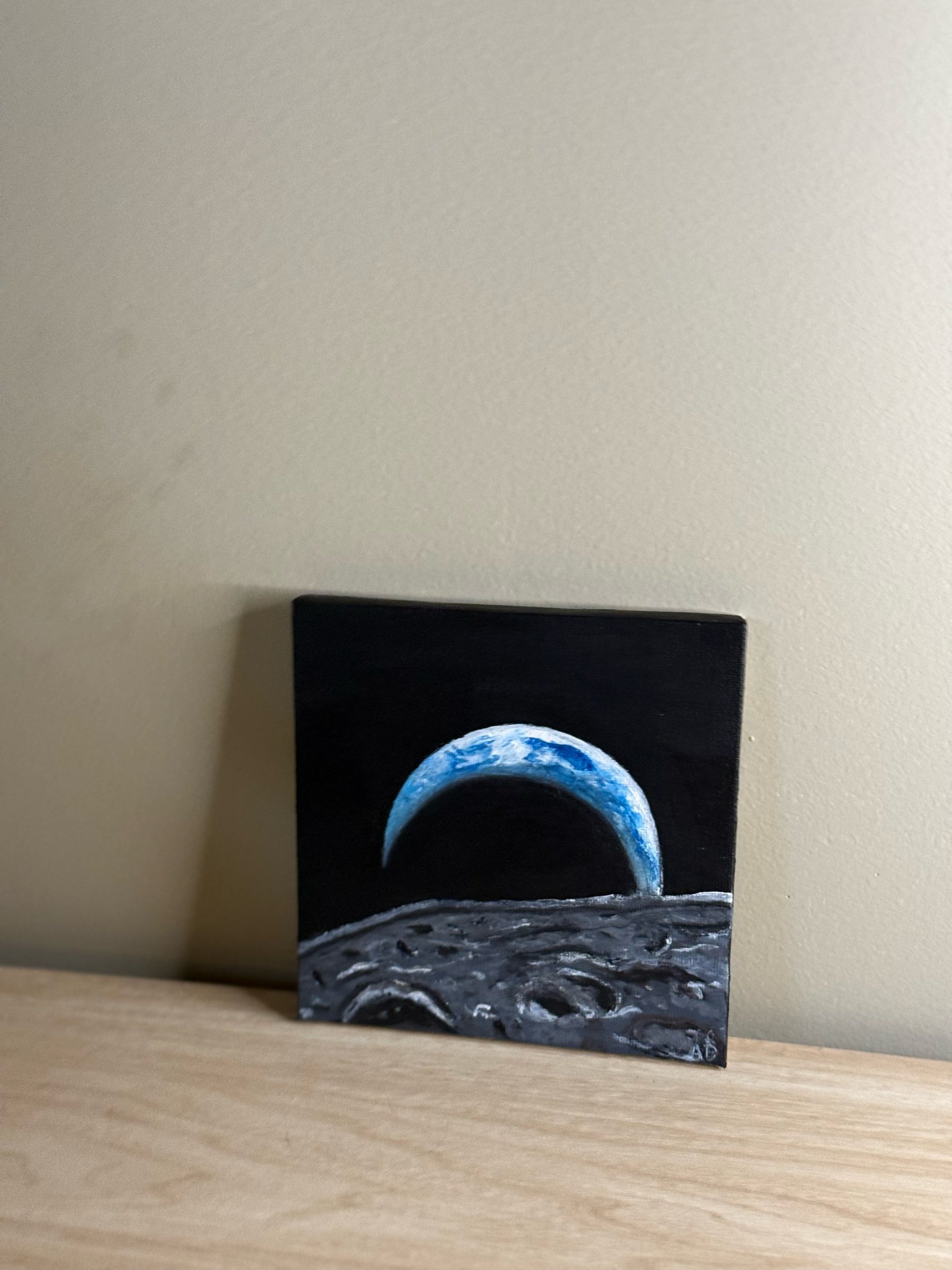 This original 6 x 6 inch acrylic painting on canvas captures a moment that will redefine how we see our place in the universe—the first “Earthset” witnessed by humanity during the Artemis II mission. As our home slips below the lunar horizon, the familiar becomes distant, transforming Earth from a place we stand on into something we behold.
